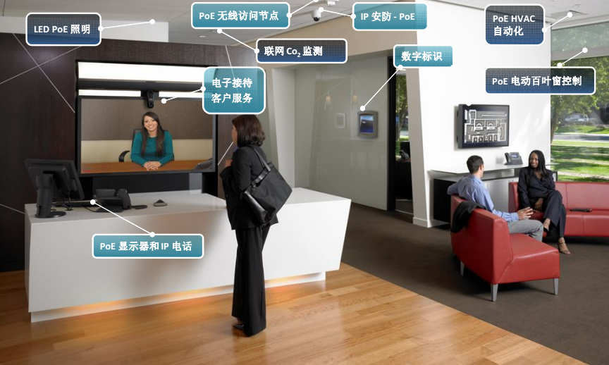 \u00A0\u00A0\u00A0 给大家看一下我们畅想未来办公的场景,这个场景当中有很多的智能设备,所有的这些设备,不管是PoE供电,AP,还是照明,甚至窗帘和空调,所有的设备都可以通过我们统一的链路来对它进行连接,对它进行供电,而不需要额外的电线对它进行单独的供电。