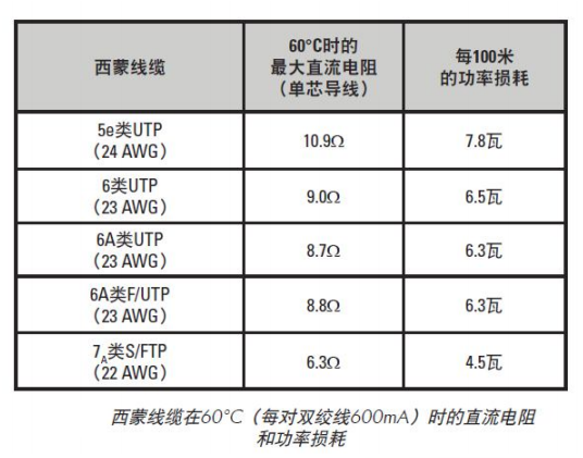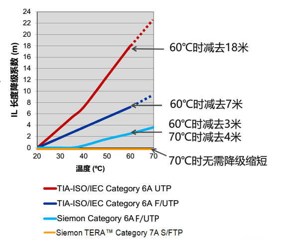 \u00A0\u00A0\u00A0 下面一根浅蓝色和黄色的线,是西蒙的6A屏蔽线缆和7A类双层屏蔽线缆,在60度和甚至是70度缩减的距离,比标准的缩减少很多,如果需要在比较恶劣的极端环境下给终端设备供电,我们建议大家采用更高等级的屏蔽线缆,使支持的信道的距离更长。一个标准的信道是100米,如果减少这么多的长度,它覆盖的面积就会小很多,其实也是一种浪费。同时,如果在高温的时候,不仅距离会缩短,还有功率损耗会增加,当我们在给设备供电的时候,在高温的情况下,每一百米的线缆线缆就有不同程度的功率损耗,图表是5e类,6类,6A类和7A类的功率损耗数值,可以看到,线缆的等级越高,功率损耗越小。如果线缆支持弱电应用就不会存在这个问题,当我们以后需要大面积给设备供电的时候,它就会成为我们计算能耗的一个比较关键的指标。