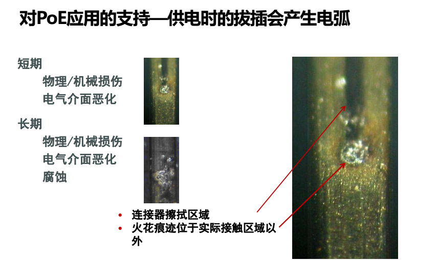 \u00A0\u00A0\u00A0 刚才说了很多关于标准和PoE以及融合布线的概念,那么综合布线能提供哪些支持呢?第一个支持,如果是常规的弱电应用,跳线拔插的时候不会出现电弧,因为走的是弱电信号,当给线路增加供电的时候,拔插的时候就会产生火花,这个火花的出现会产生什么影响?短期经过火花的灼烧会造成机械、电气介面恶化,长期的火花灼烧,包括氧化的原因,器件表面会产生接触不良。怎么避免这样的一个问题?西蒙有一个产品叫做PoE之王,这是模块和跳线配合的方式,传统来讲我们电缆跳线和模块,接触点和使用点往往在同一个点上,这就造成刚才我们提到的问题,如果我们设计成它的接触点和它实际使用的这个点不在一起的时候,我们就避免了这个问题,所以这是我们的一个专利,我们也叫做PoE之王。