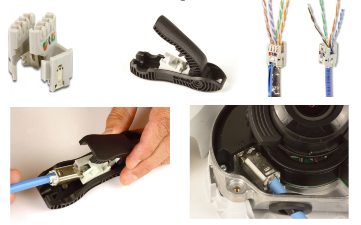 \u00A0\u00A0\u00A0 这种端接的方式,只需要一个小工具通过简单一压的方式,就能把它做成一个类似于跳线的插头,右边的图片是插在监控设备头里面的一个示例。