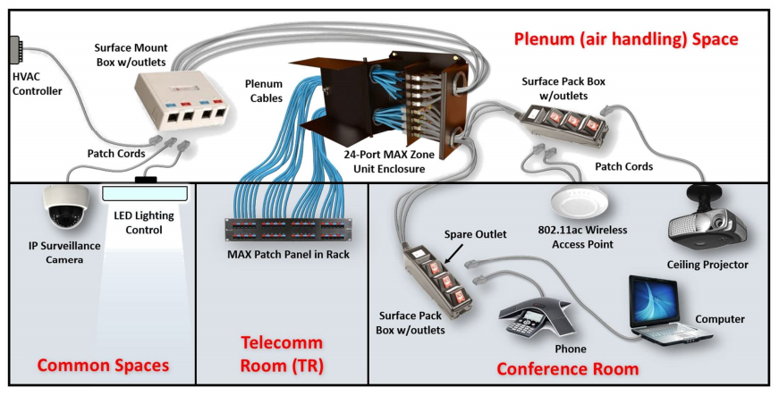 \u00A0\u00A0\u00A0 除了刚才提到的端接插头以外,我们还有一个产品叫做区域配线箱,它是一个盒体,或者可以把它当成一个小的机柜来理解,但不完全是一个机柜的概念,它可以作为一个CP点或者集合点,在区域配线的时候,它可以连接很多不同的终端设备,包括电脑,电话,照明等等。传统来讲,在一个大楼里面,我们通常不太会用这样的一个方式,因为在一个房间里面,主要是数据的点位,可以一次性部署到位。但是对于智能建筑而言,还包括照明、安防、门禁等智能设备需要接入网络,有时无法一次部署到位,这时候我们布线的时候就需要一个结点,它就叫区域配线箱。覆盖范围是13米,所有电信间引来的线缆首先接入它,再通过它向所有终端设备进行连接和供电。作为一个节点,它可以放在墙壁上也可以放在天花板里面,可以对相关的设备进行重新摆放,实施速度也比较快,不需要从电信间进行重新的布线,这是一中新的布局,不像传统从电信间的配线架再拉到终端点位的一种新的方式。