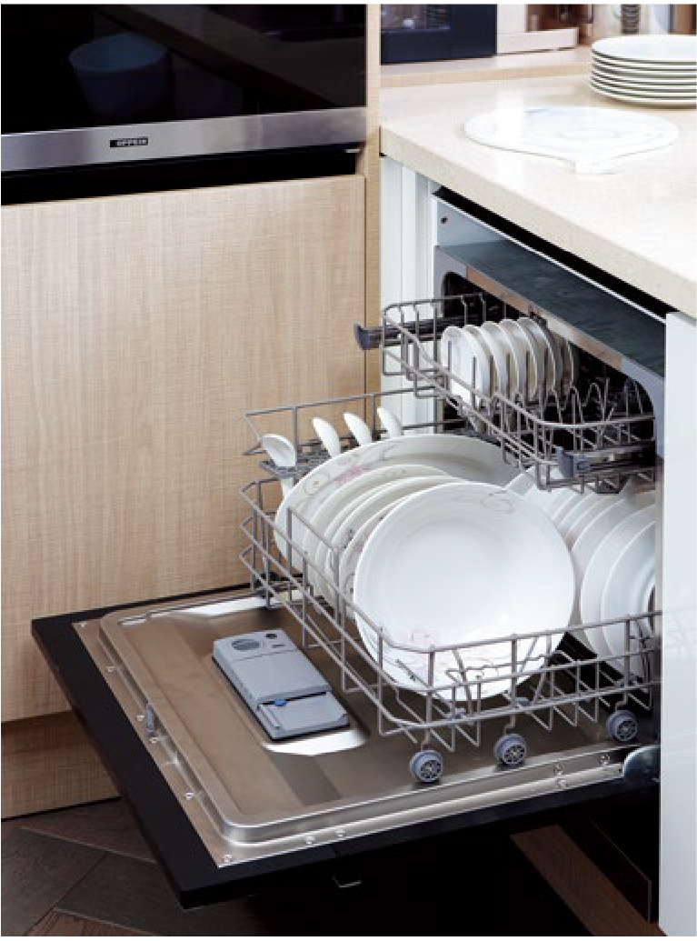 .嵌入式洗碗机门板与橱柜门板统一,让洗碗机隐藏不见,完美嵌入。