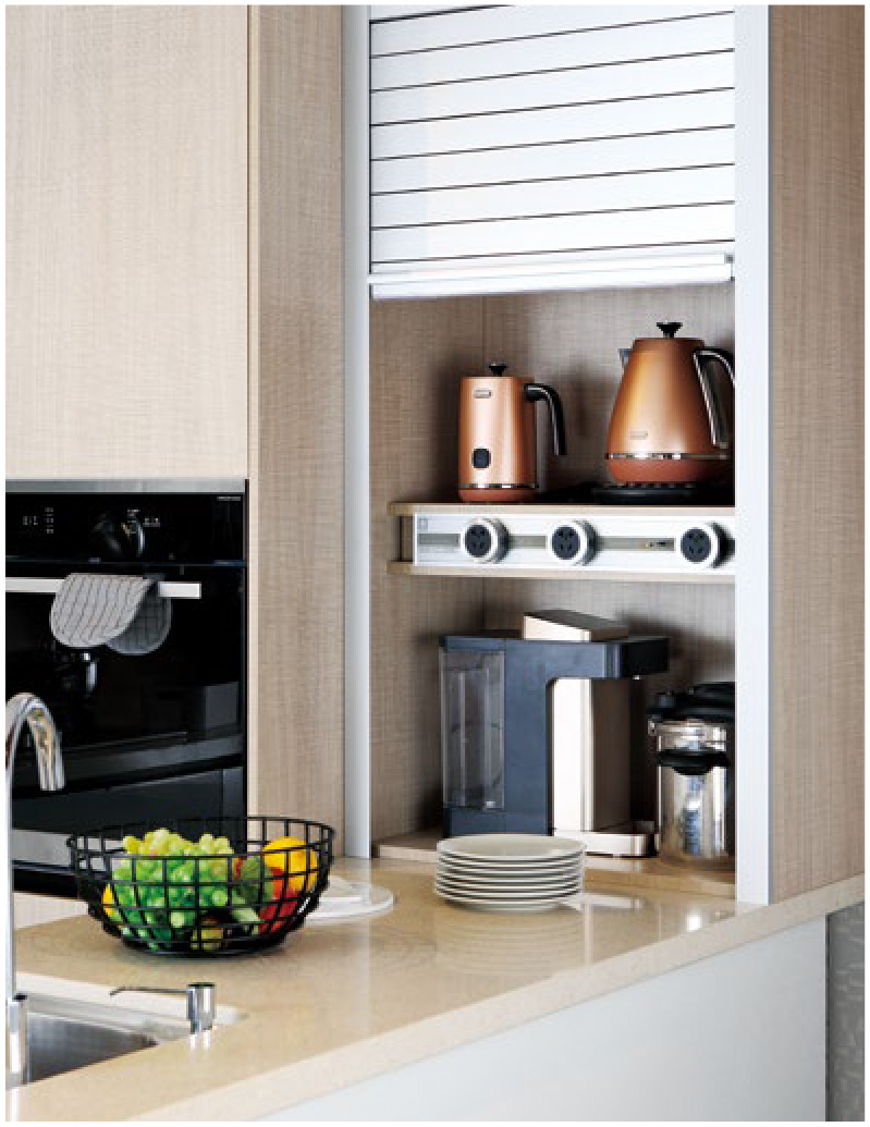 安装一个铝制卷帘门,将开放柜中的各色小家电封闭起来,整洁、卫生,且只占据了40厘米的宽幅。内置随意停插座,家电不挪动就能直接使用。