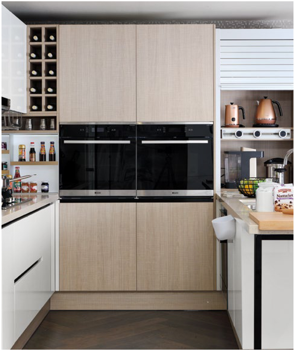 对于不常下厨,但偶尔会做几道甜点的人来说,烤箱能帮你提升乐趣,改善生活品质。全触摸式开关控制的烤箱,与橱柜的融合更加完美,超大的LCD显示11段烘烤模式,方便智控。将烤箱嵌入原木色高柜之中,给橱柜带来清新之感。