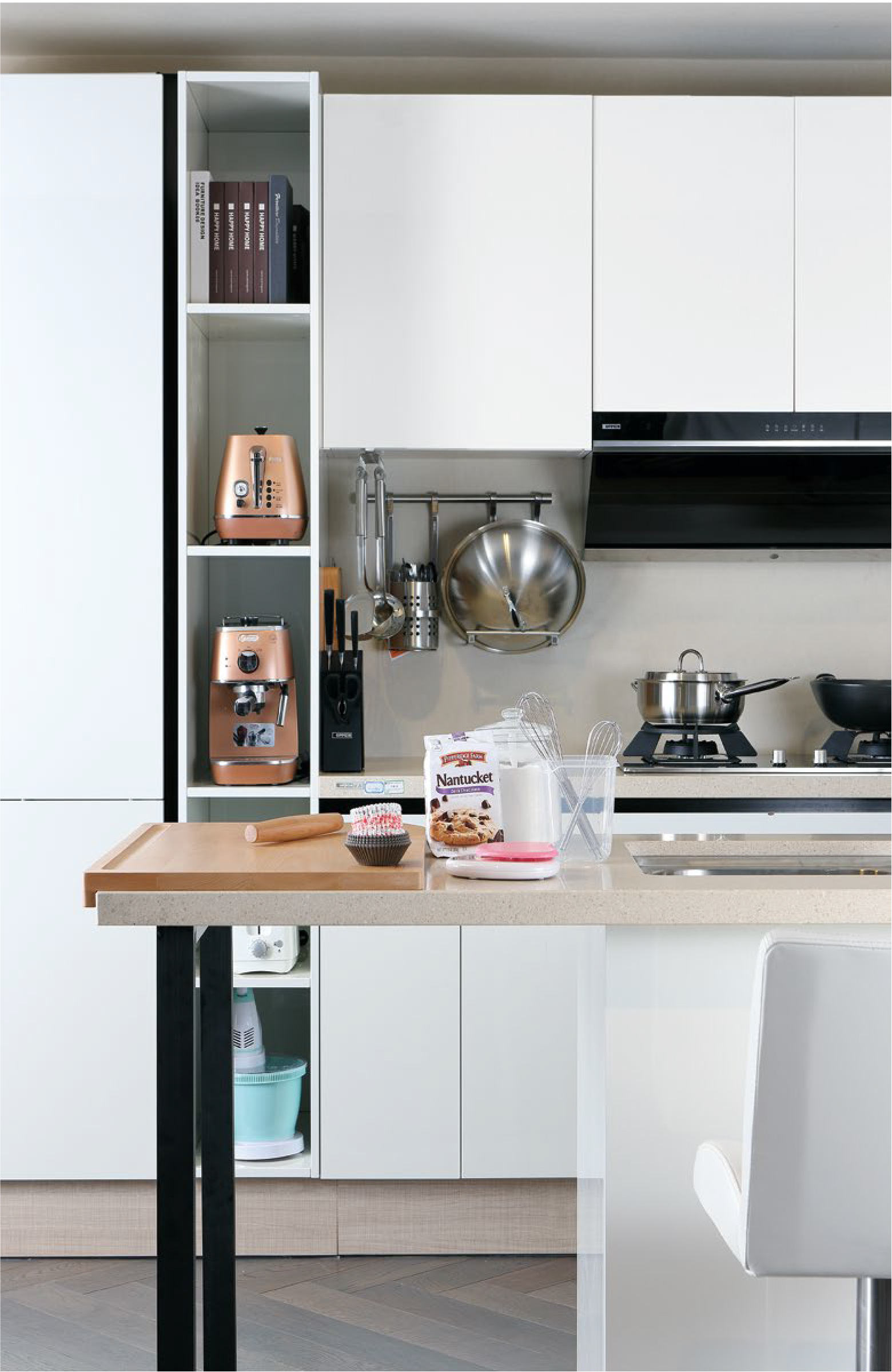 在忙碌的工作之余,还能偶尔有一些时间和心情做一道精致的甜点,已是难得的小确幸。咖啡机、多士炉、搅拌机、榨汁机,高颜值的小家电一一陈列,还有操作台与早餐桌合二为一的设计,紧凑拼接出我们想要的幸福生活。