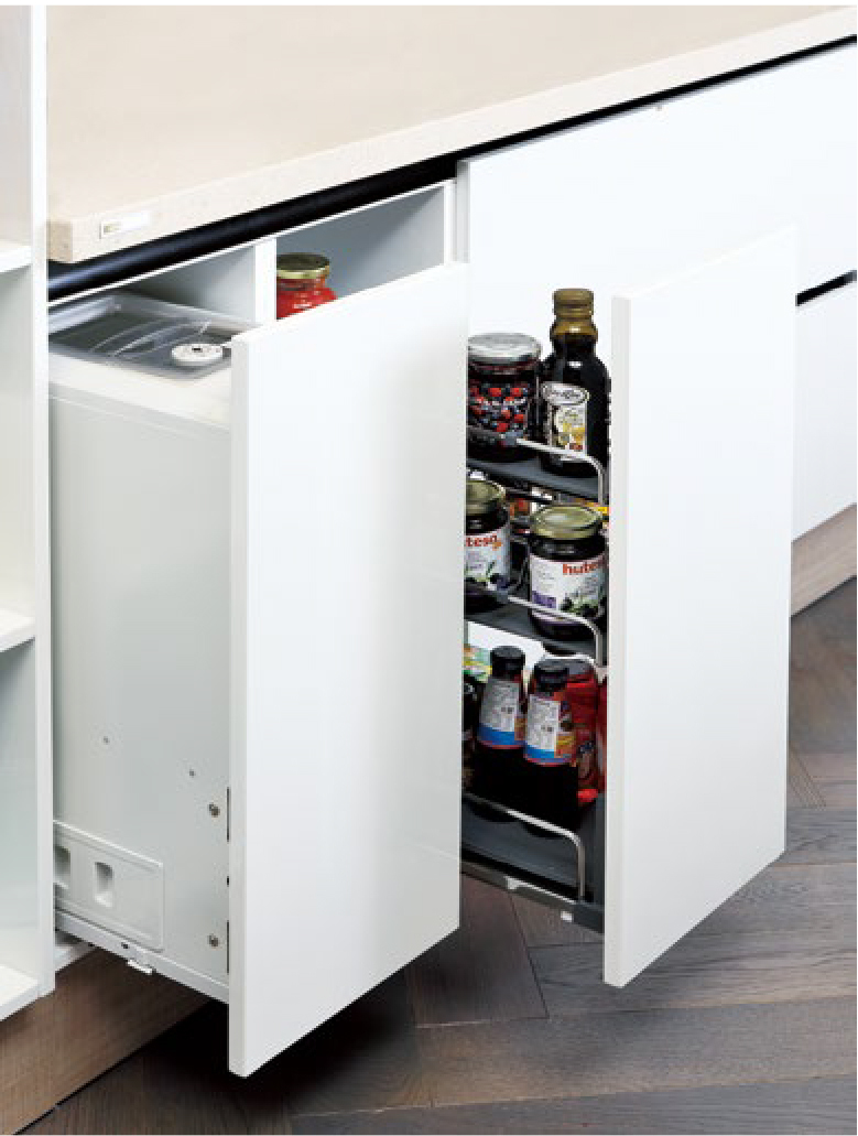 采用超窄多功能拉篮结构,是油盐酱醋的储物宝地,灵活配置空间,自由储放。专业的米面箱让粮食收纳也便捷。