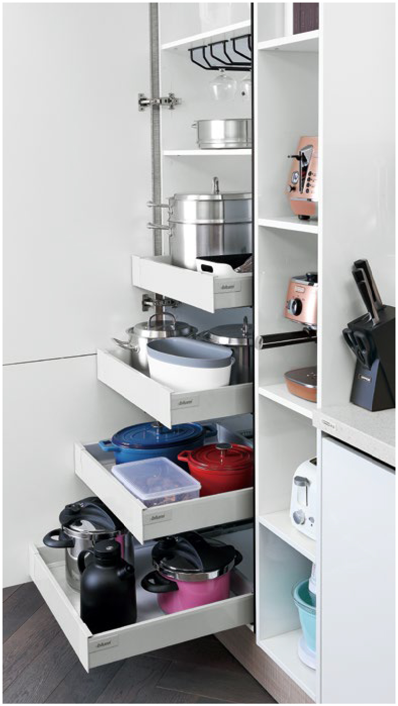 对于炊具可用高柜集中收纳,大小不一的规格以不同高矮空间收纳,科学合理地安放,让空间利用最大化。