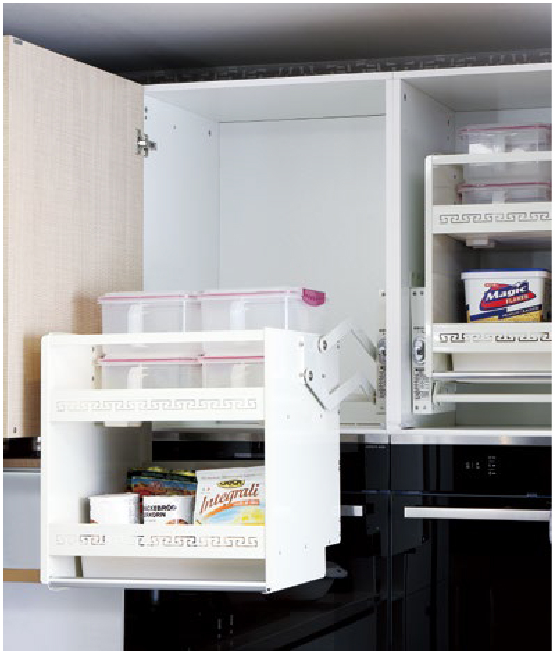 对于身材娇小的人来说,吊柜中收纳的物品往往只能选择长期不用的。在吊柜中安装下拉拉篮,物品随之送到我们触手可及的地方,很好地解决了身高不够的问题。