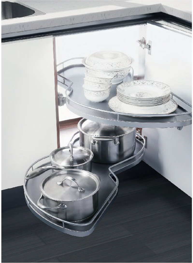 在橱柜转角处设置飞碟拉篮,可以最大程度利用四角空间,双层收纳的联动设计,轻松拿取。