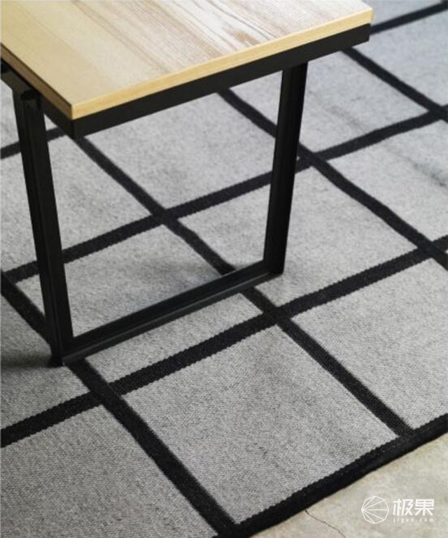 桌椅和储物柜、储物盒、篮筐、挂杆、挂衣架、装饰灯材质上主要是钢材,配件上采用了一些铝,有板材的地方采用的都是刨花板配合白蜡木贴面加哑光清漆饰面密封。地毯是由纯棉和纯羊毛分经纬线编织而成,更加耐用。休闲毯是纯羊毛织就,更加舒适保暖。