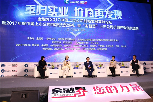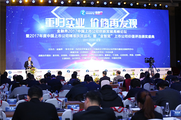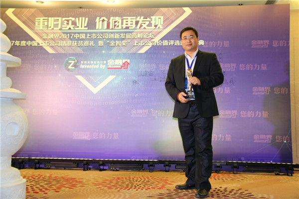 2017年11月23日,由中国上市公司协会中国证券业协会证券投资咨询专业委员会指导,金融界主办的2017中国上市公司创新发展高峰论坛暨2017年度中国上市公司精准扶贫巡礼暨“金智奖”上市公司价值评选颁奖盛典,在北京粤财JW万豪酒店成功举办。