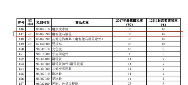 据悉,从12月1日起,我国将进一步降低部分消费品进口关税,此次降税范围涵盖了食品、保健品、药品、日化用品、衣着鞋帽、家用设备、文化娱乐、日杂百货等各类消费品,共涉及187个8位税号,平均税率由原来的17.3%降至7.7%。其中,智能马桶盖由32%降至10%。