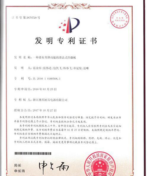 日前,从国家知识产权局获悉,由浙江潮邦厨具电器有限公司申报的科研成果 “ 一种带有升降功能的滑盖式挡烟板”、“一种集成灶的联动装置”获国家发明专利。截至目前,潮邦公司已获4项国家发明专利,持有的有效国家专利达到30余项,国家专利持有数量名列行业内前茅。