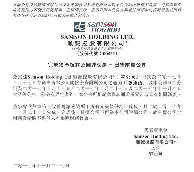 11月27日,顺诚控股(00531-HK)发布公告称,公司间接全资附属Samson Pacific作为卖方,拟向公司执行董事及控股股东郭山辉、刘宜美旗下New Success (HK)出售东莞台升家具全部已发行股本,总代价人民币4.8亿元,预期出售事项产生收益约7000万美元。
