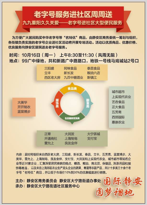 今年10月是“敬老月”,为了更好地服务广大居民群众,特别是更好地满足社区老年居民朋友们的需求,特于2017年10月16日在“99广中绿地”举办“九九重阳久久关爱”——老字号进社区大型便民服务活动,把“名特优”产品送到居民家门口。