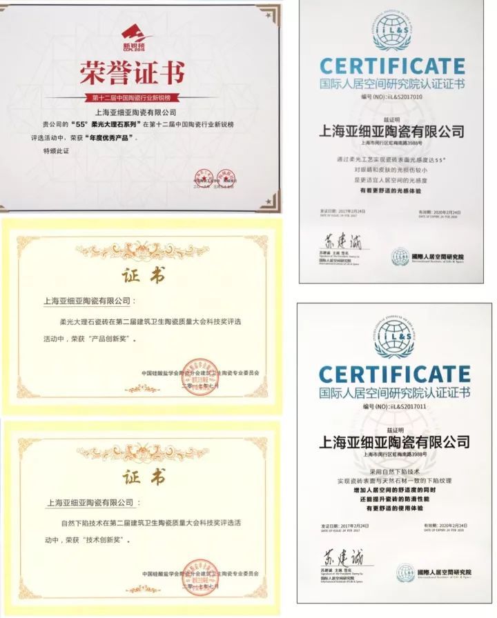 独立创新的四大技术,推进行业重新定义了大板大理石瓷砖。相较目前市场上其他的大板大理石,亚细亚大板系列产品集55度柔光、立体下陷、全通体、大规格一体,打响了国内大板大理石领域的第一炮!专利技术及产品获得国际人居空间研究院、中国陶瓷工业协会、中国硅酸盐学会陶瓷分会首肯,获奖无数。