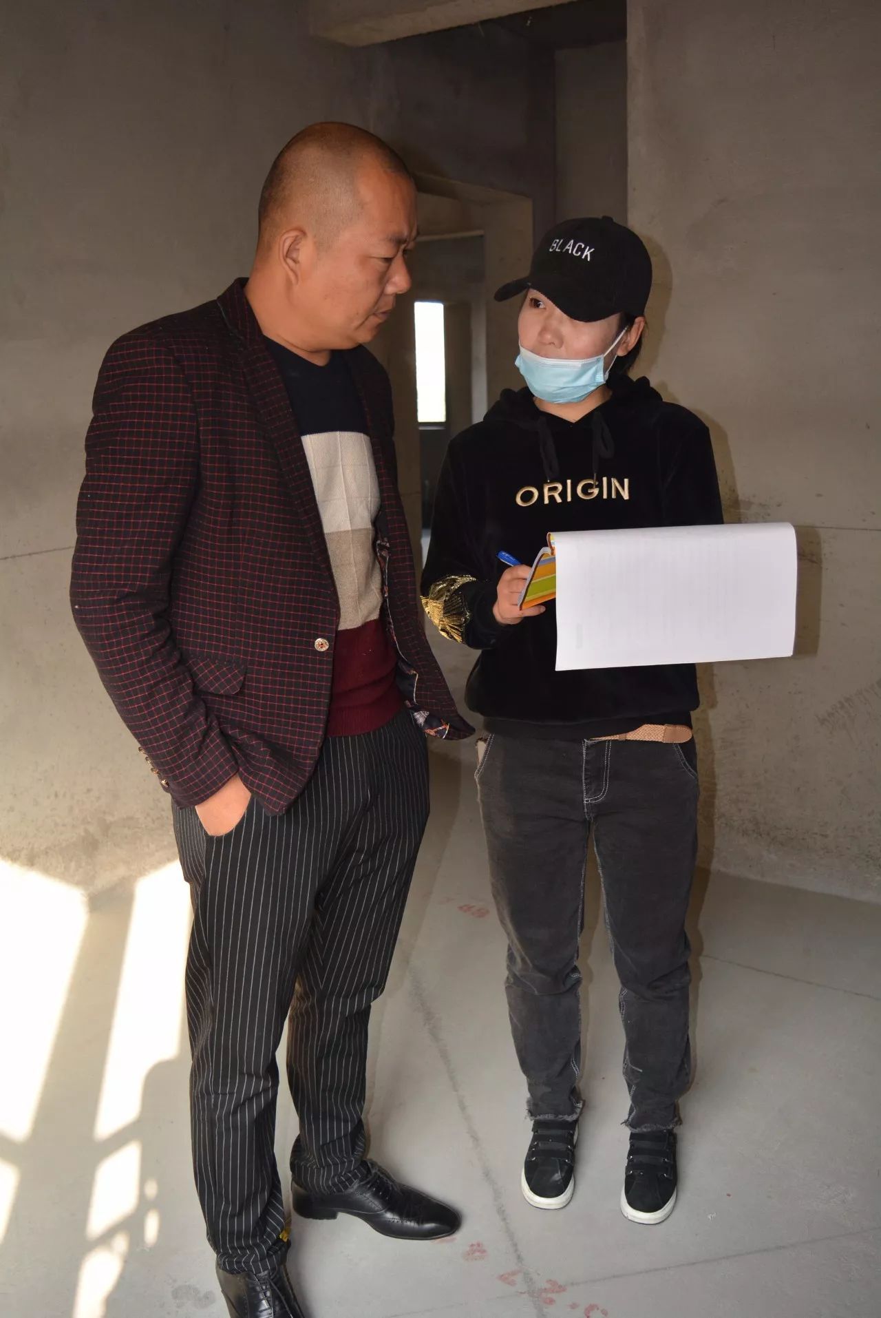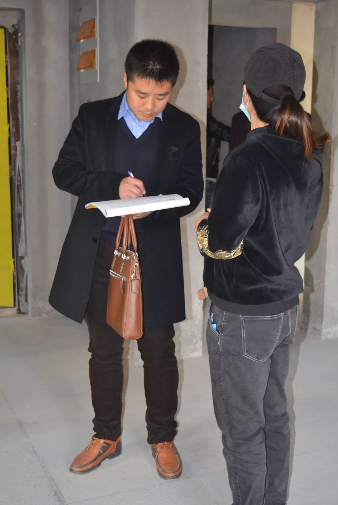▲交底结束,业主吉先生与工程部梁经理分别在施工图纸和《客户私化服务流程图》上签字确认。