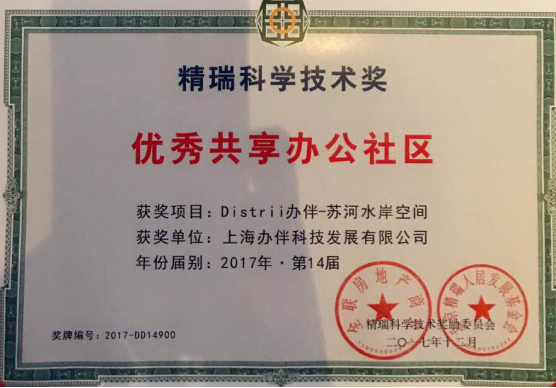 (图2 Distrii办伴荣获精瑞奖优秀共享办公社区称号)