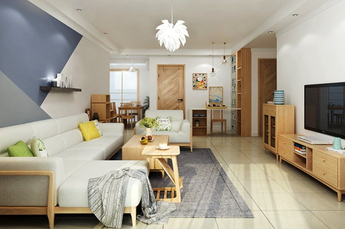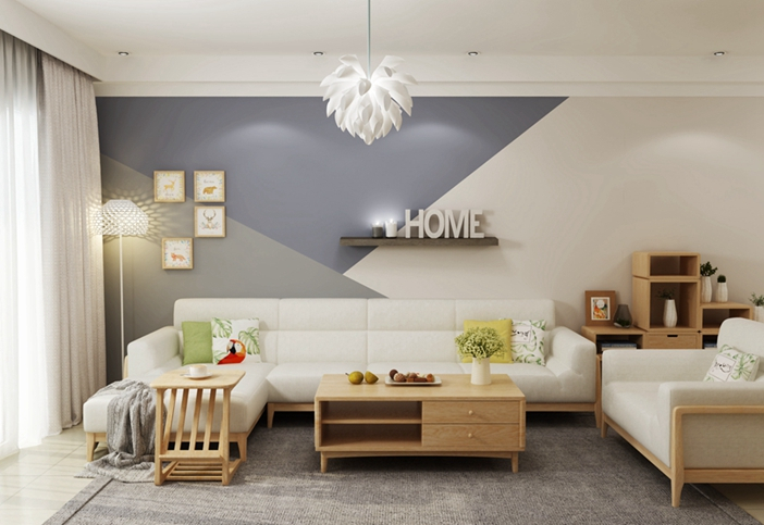 几何造型的沙发背景墙让客厅更显时尚感,而素净的林氏木业布艺实木框沙发,平衡了墙体与灰色地毯相对浓烈的色彩,让空间回归舒适与温暖。实木收纳柜组合充当边几功能,把杂物通通藏起来,让家始终整洁如一。