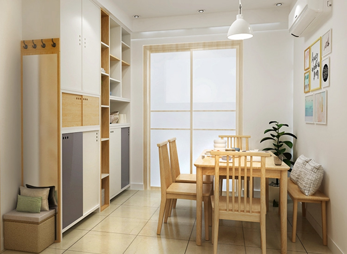 如果说白墙的餐厅毫无生活气息,那么一面照片墙便能让家更“接地气”。如果没有入户玄关,那就把它并入餐厅吧!在餐厅做整墙定制柜子,一边是鞋柜,一边则是餐边柜,同时兼顾全身镜与换鞋凳的功能,出门前都能舒心的整理着装。