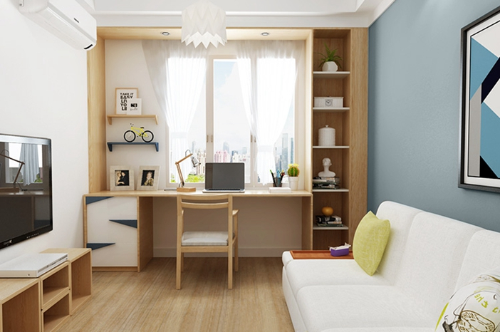 在明净的窗前摆放定制电脑桌,让玩游戏或是工作,都能在饱览美景的愉悦心情下进行。工作累了,靠在沙发上看上一部电影,也是牧野最喜欢的放松方式之一。
