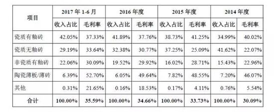 招股说明书显示,瓷质有釉砖在收入结构中占比由不到35%增加至42%,以抛光砖为主的瓷质无釉砖逐渐失宠,占比从41%降29%。