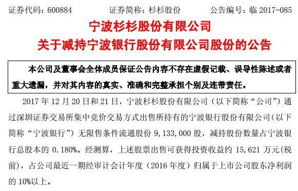 原标题:杉杉股份减持宁波银行股份 获收益1.56亿元 杉杉股份(600884)公告,2017年12月 原标题:杉杉股份减持宁波银行股份 获收益1.56亿元 杉杉股份(600884)公告,2017年12月20日和21日,公司出售所持有的宁波银行无限售条件流通股份913.3万股,减持股份数量占宁波银行总股本的0.180%。 经测算,上述股票出售可获得投资收益约1.56亿元(税前),占公司最近一期经审计会计年度(2016年度)归属于上市公司股东净利润的10%以上。