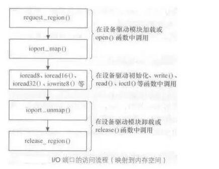 直接使用IO端口操作函数:在设备打开或驱动模块被加载时申请IO端口区域,之后使用inb(),outb()等进行端口访问,最后在设备关闭或驱动被卸载时释放IO端口范围。