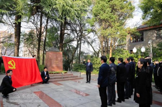 面对鲜红党旗,集团公司党委书记高登榜同志率领班子成员和集团机关党员,庄严郑重地举起右手,重温了入党誓词。