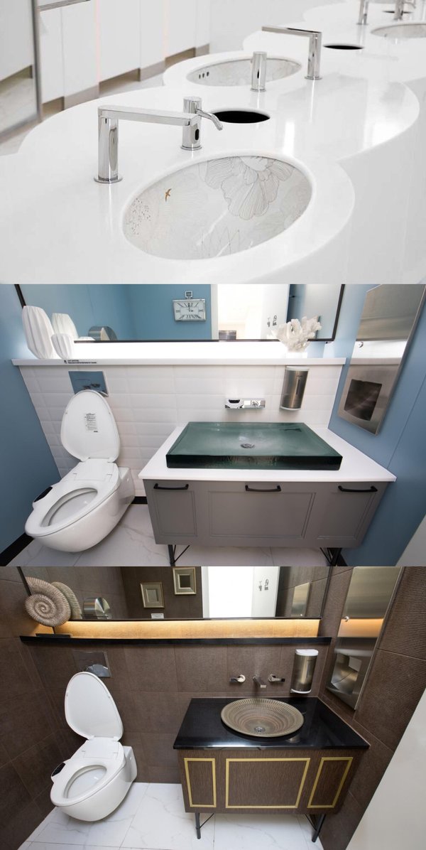 由上至下,分别为科勒夏宫时尚台盆、透丽水漫式艺术台盆、德灵水漫式艺术台盆