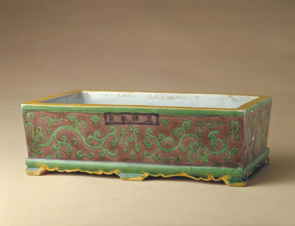 素三彩瓷器的烧制,始于明正德年间,您看北京故宫珍藏的“明正德素三彩缠枝莲纹高足碗”、“明正德素三彩缠枝莲纹长方水仙盆”。后来的嘉靖、万历年到明末,也生产过一些。素三彩主要是用于祭祀和冥器使用的,一般制作较粗糙,数量有限,在明代瓷器中也黯淡无光。