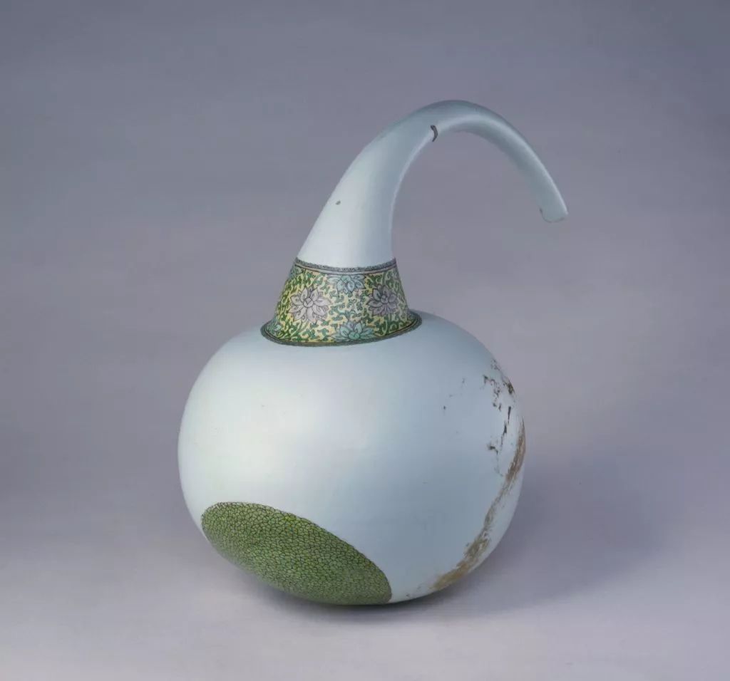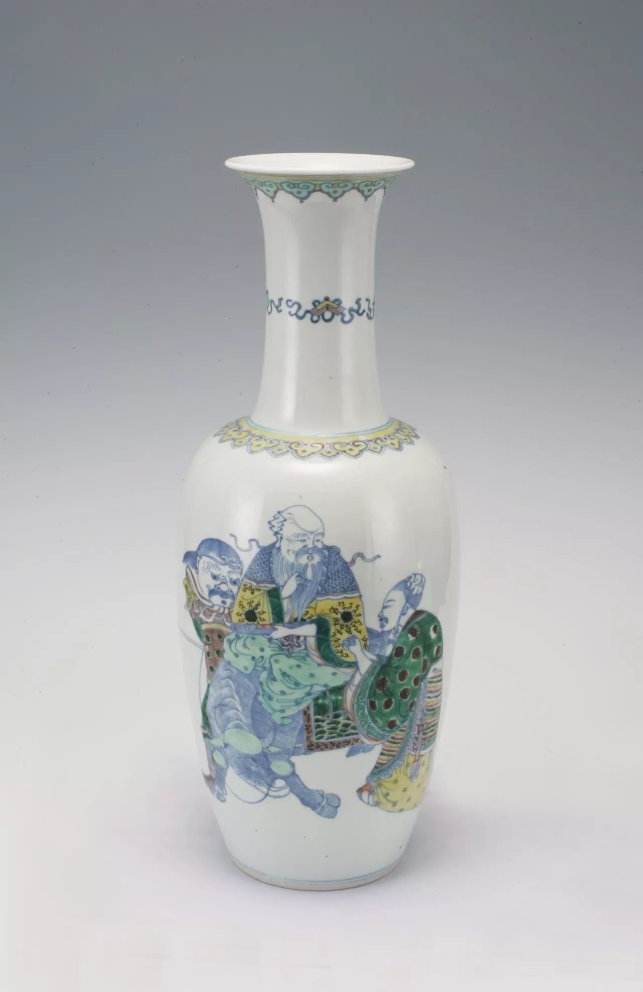 再说说清代的斗彩瓷器。康雍乾官窑有不少精品堪与成化斗彩媲美,清代的斗彩瓷器大多数绘画精致,改变了成化斗彩“叶无反侧”、“四季单衣”的不足,图案性更强,产量也要大于明成化时期,但没有成化斗彩清秀飘逸的风采。康雍乾官窑,都有一些仿成化斗彩的产品,特别是雍正时期,已能很好地仿烧出成化斗彩,但这些仿品大都署本朝年款或不落款,只有少数寄托成化款。您看观复展出的“康熙斗彩老子出关图莱菔瓶”,莱菔就是萝卜,还有北京故宫收藏的“雍正斗彩团花天球瓶”和“乾隆斗彩双龙纹抱月瓶”。