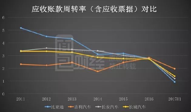 而对比同为自主品牌的吉利、长城以及长安汽车,比亚迪的应收账款周转率也排名最低,17年上半年的0.93次,远低于排名第一吉利的1.95次。