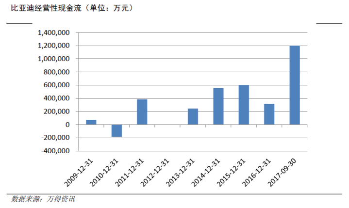 从比亚迪经营性现金流数据来看,在近9个财年当中,仅2010年出现经营性现金流流出,即便在2012年净利润降至冰点,还保持CFO为正,而在今年这一指标创出历史最高。