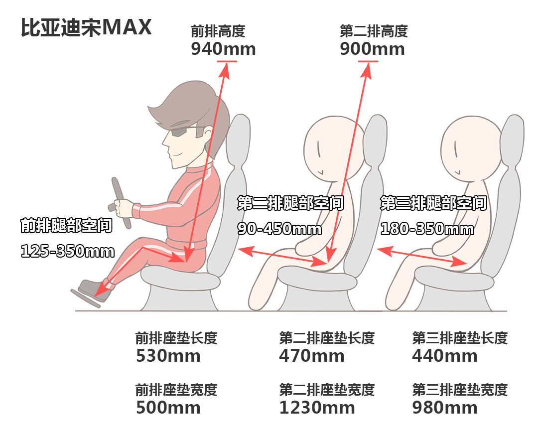 作为一台七座的MPV车型,空间才是宋MAX最重要的地方。以驾乘者身高为176cm为例,那么它的表现还算可以。