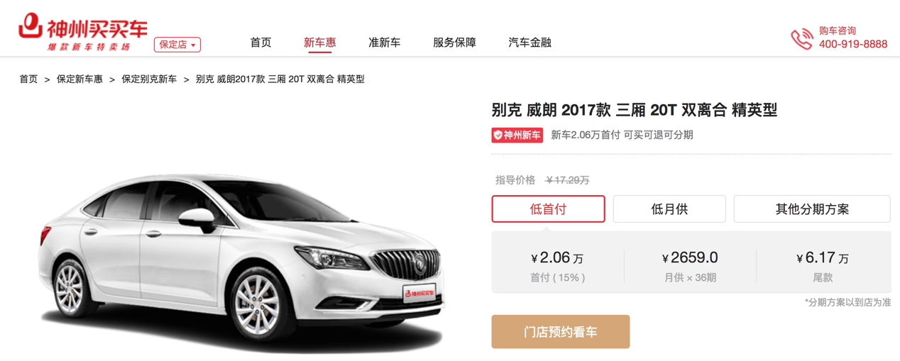以2017款别克威朗三厢20T双离合精英型为例,同样选择 “先享后买”低首付提车,首付15%仅2万元左右,36期月供低至2600元左右。