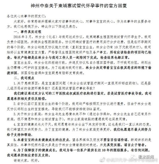 林女士称,这家代孕机构让她去柬埔寨代孕,包孩子健康出生、包DNA、包回国,花45万就行,林女士与这家代孕机构签订了合同。 2017年7月26日,在林女士的陪伴下婴儿出生,但孩子被检查患有黄疸,林女士认为与代孕机构不履行合同有关,与公司沟通未果,便带孩子回国治疗,没有交付剩余的10万元尾款。回国后,孩子经过检查后又确诊患有脑萎缩脑积水,为给孩子治病,林女士先后花了200余万。\u00A0