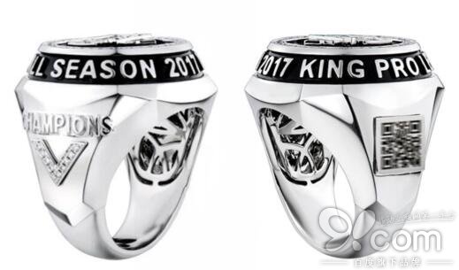 以全满钻镶嵌打造出象征最高荣誉的王者之戒,正面圆形的设计,加上灿若繁星的黑、白钻石簇拥中间的标志,诠释圆满团结的战队精神。