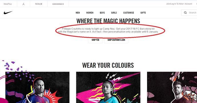 北京时间2017年12月31日,耐克的巴萨官方网上商城出现了“库蒂尼奥即将加盟巴萨”的消息,还配上了这样的字样——“库蒂尼奥即将闪耀诺坎普,请购买巴萨17-18赛季球衣,并且印上魔术师的名字。从1月6日开始,可以在官网购买。”