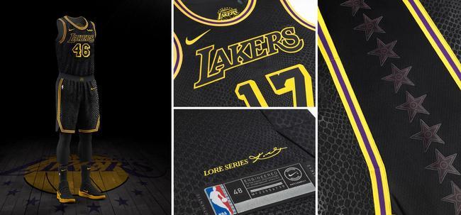 以湖人为例,科比·布莱恩特成为了第一个湖人城市版球衣设计灵感来源。该款球衣的采用了黑曼巴花纹,裤腰处印有湖人队24号的号码。球衣的侧面印有16颗星,象征着湖人队至今共赢得的16个NBA总冠军,彰显了湖人辉煌的传统。