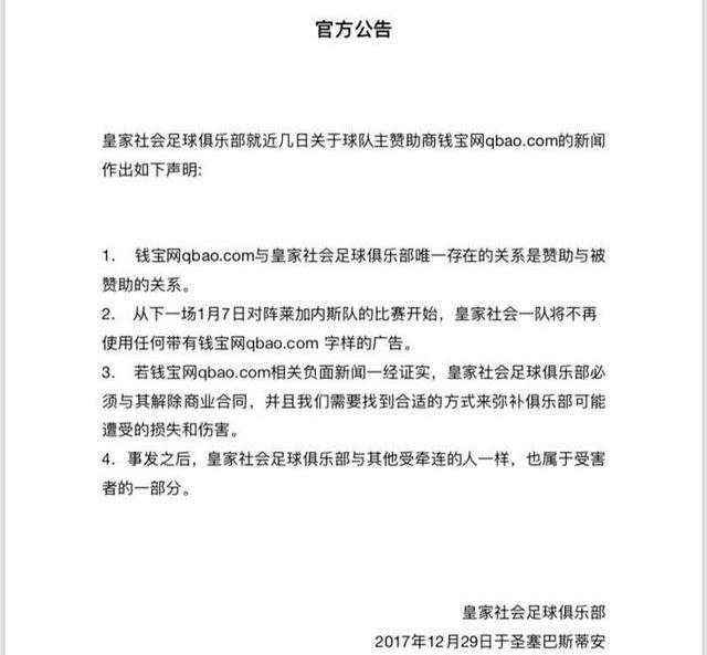 对此,皇家社会于北京时间2017年12月30日通过官方微博发布《关于钱宝网事件的官方公告》,澄清俱乐部与钱宝网的关系,并做出撤掉钱宝网广告的决定。对于皇家社会而言,及时断绝与涉嫌违法犯罪的赞助商之间的关系,以免产生过度牵连,无疑是明智之举。