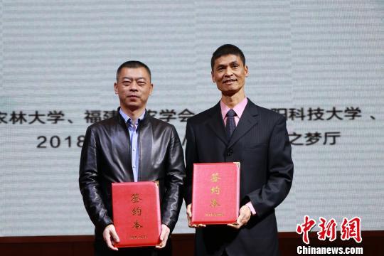 \u00A0\u00A0\u00A0\u00A0晋江市农业局局长、市美丽乡村办常务副主任李友加(左)与台湾朝阳科技大学代表互换合作协议。牛效礼摄