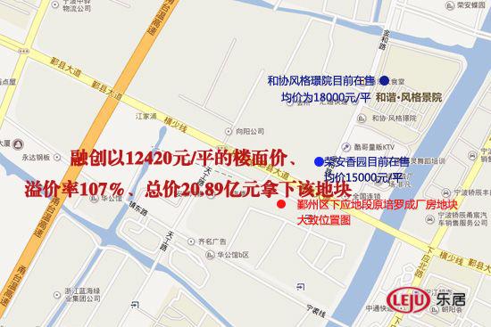 ??新浪乐居讯(编辑 管小妮)8月过半,宁波土地市场淡季不淡。继前两场热闹的土拍之后,今日(8月19日)土地再次激起“波澜”。最终,融创以12420元/平的楼面价、溢价率107%、总价20.89亿元拿下鄞州区下应地段原培罗成厂房。