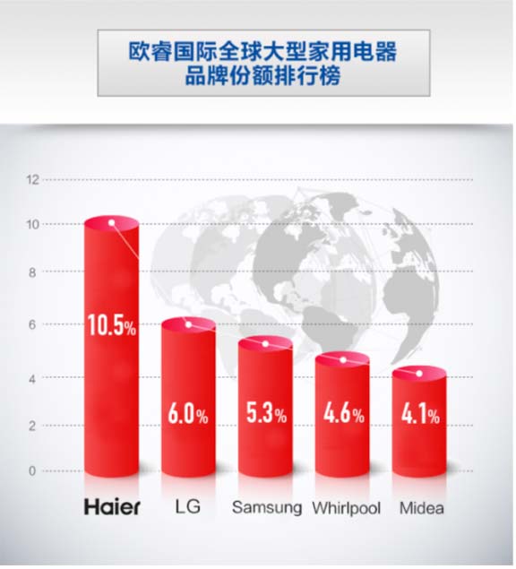 自主创牌在为“中国制造”正名的同时,也为海尔带来了强大的市场影响力。欧睿国际最新数据显示,在全球大型家用电器领域,海尔以10.5%的品牌份额位居榜首,这也是海尔第9次蝉联全球第一,成为中国家电全球化第一品牌。