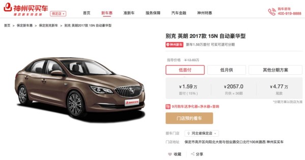 以位居爆款新车榜首的别克英朗2017款 15N 自动豪华型为例,选择“先享后买”低首付购车方案,首付15%、36期月供,首付仅1.6万元,每月还款2000元左右。如果前期购车预算充足,还可以选择“低月供”方案,月供低至1400元左右,后期还款毫无压力,还能同时享受订金翻倍,新车直降4000元的优惠。