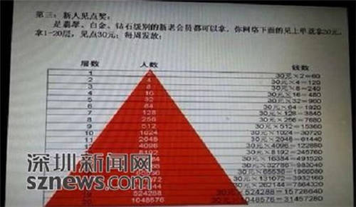 第一重回报叫“还本奖”,连续52周返还144.23元的代金券,共返7500元,即7500元享受15000元产品;第二重回报叫“见单奖”,每见一个单拿30元,20层下线内的单都可拿;第三重回报叫“对碰奖”,“天福天美仕”走双轨、周薪模式,按照AB区营业额较小区域业绩的15%作为“对碰”工资,小区稳定达150万业绩的时候,就能拿到18万以上收入;第四重是“领导奖”,十层以内的下线收入都能拿到提成,号称10代收入,第一层下线收入拿10%,第二层5%,第三层3%……只要不断发展下线,都能拿到对应提成,最高能拿至6000多万。