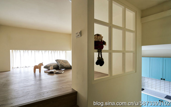 ▲使用频率低的书房,维持基本坐卧高度,并搭配白色格子光窗,将光线再次往后延伸。