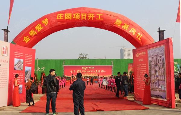 11点左右,在现场人员的共同见证下,金马集团荣誉董事长李素真女士、安徽华源医药马总、金马集团董事长马莉娟女士、安徽瑞安建筑黄总等领导人上台进行奠基剪彩仪式,六发礼炮齐鸣,各位领导移步台下,进行奠基培土仪式。