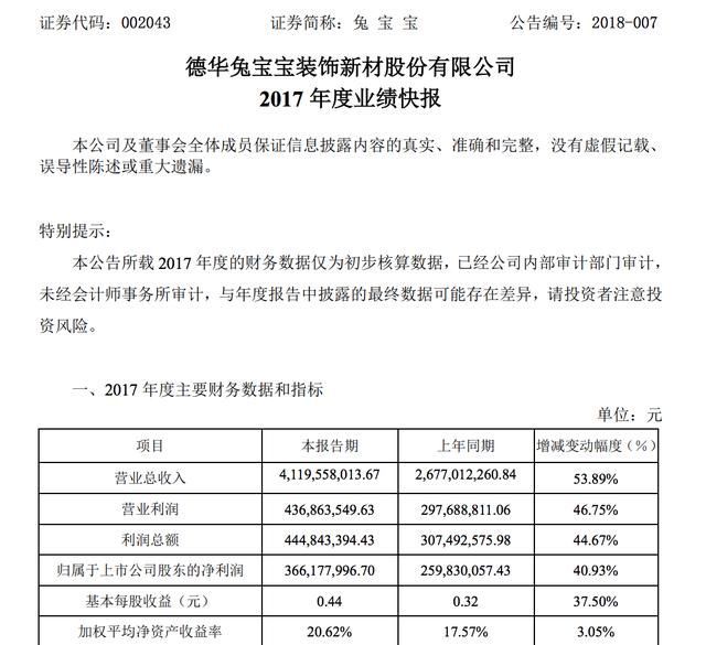 2月3日,兔宝宝发布2017年度业绩快报。