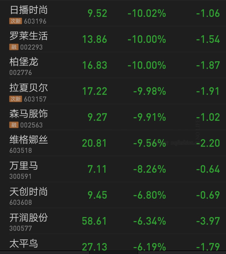 另外,森马服饰(002563.SZ)、维格娜丝(603518.SS)周二亦几乎跌停;跌幅超过8%的还包括次新股万里马(300591.SZ)、三夫户外(002780.SZ);九牧王、七匹狼、汇洁股份、朗姿股份、星期六、天创时尚等个股跌幅介于4-8%。